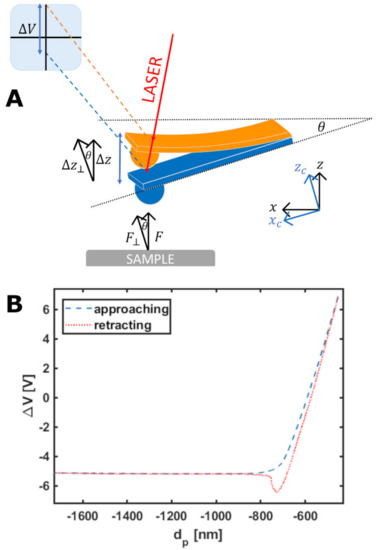 In AFM, an elastic cantilever with an intrinsic spring constant k in the range 0.05–50 N/m is used as both a force sensor and a force transducer (Figure 1A). The surface force F is applied on the cantilever, typically at its end, where a micro-tip with a radius of curvature of typically 2–100 nm is located. The force induces a vertical cantilever deflection , which is typically measured by an optical beam deflection apparatus [38,39,40] (Figure 1), or in some cases by an interferometer [41]. In the above equation, an effective spring constant is used, rather than the intrinsic one, to account for specific features of the loading configuration, such as the cantilever mounting angle (usually = 10°–15°), the tip height, the loading point position, etc. [42]. In the simplest case of a negligibly small tip at the very end of the cantilever, .