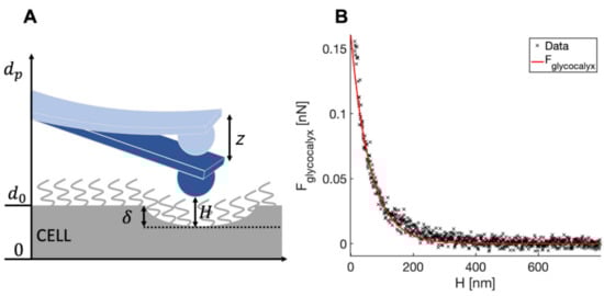 The glycocalyx characterization was performed following the soft brush model implemented by Sokolov et al. [27,31,65,66]. The separation H between the tip and the cell membrane can be expressed as (Figure 3A):