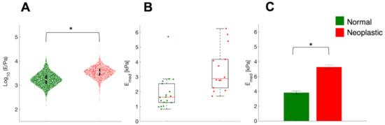 The stiffening of ECM in CRCPM samples. (A) Logarithmic values of the YM and their distribution in normal and neoplastic ECM samples obtained from one patient. Violin plots were plotted collecting YM values from all single FCs. Violin plots suggest that the distribution of local YM values is approximately lognormal. The circle and the black bars represent the median and the interval between 25th and 75th percentiles. (B) Comparison of median YM values Emed from each force volume in linear scale for normal and neoplastic samples from one patient. The red line represents the median value, the box encloses the interval between 25th and 75th percentiles of the sample. Whiskers go from the upper and lower limits of the interquartile range to the furthest observations, within 1.5× the interquartile range; data points beyond this limit are considered outliers. (C) Comparison of the mean median YM values for the two conditions tested. In (A, C), * means p < 0.05.