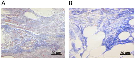 During cancer progression, the neoplastic ECM becomes stiffer; indeed, the logarithmic YM distribution appears rigidly shifted to higher values (higher median value), while the logarithmic standard deviation is approximately preserved among normal and neoplastic conditions (Figure 4A). In Figure 4B, we show the distribution of the median YM values measured in different locations (FV) and slices of ECM are reported. Neoplastic-derived samples showed a significant increase in stiffness, and this result was in line with data already published [1,2,9,74,75,76]; this stiffening during cancer progression is related to an outcome of the tumor microenvironment remodeling and changes in the ECM composition and structure, including aggregation and realignment of ECM components, mediated by tumoral cells [9]. Reorganization of the matrix through cancer progression is also a parameter that can be seen optically, with classical staining of the ECM (Figure 5). The neoplastic ECM shows collagen accumulation (Figure 5B), while the healthy counterpart shows organized collagen fibers (Figure 5A).