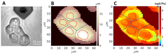 Representative images for the combined topographical and mechanical analysis of cell clusters. Optical image of a cell cluster from the RT112 cell line (A); topographic map (B), and Young’s modulus map (C) in logarithmic scale, of the same cluster shown in (A).