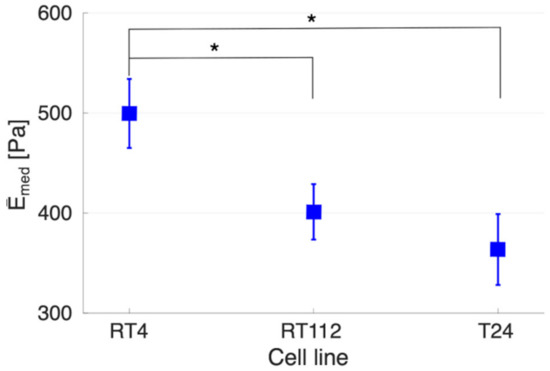 The Young’s modulus (whole cell) measured by AFM for bladder cancer cells RT4, RT112, and T24, with increasing grades of invasiveness (left to right). * Means p < 0.05.