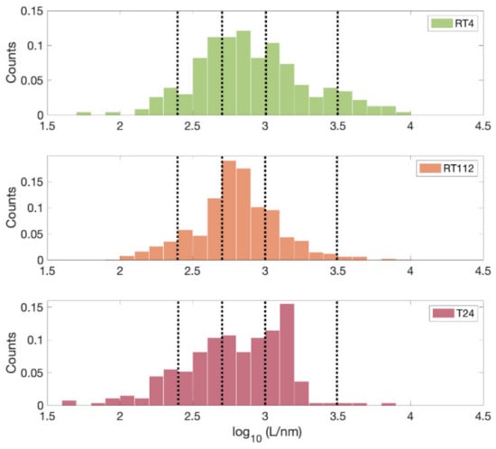 For the glycocalyx analysis, the length L of the glycocalyx for each force curve located on the nucleus was extracted, by fitting Equation (9) to the data, and the histograms of the logarithmic values were reported. Median values were calculated.
