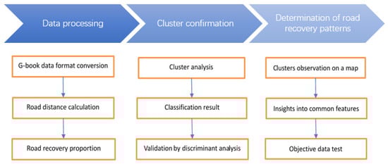 The purpose of the study was to determine the recovery patterns of post-earthquake local roads using objective data to support disaster mitigation measures. We targeted the municipal road network, which is one of the most essential elements for rescuing victims and supplying them with daily commodities, and surveyed the conditions and recovery patterns of roads accessible to motor vehicles in the municipalities of Fukushima prefecture in the first six months after the disaster. To this end, we proposed the following framework (Figure 1). First, the vehicular driving data were processed to derive the recovery conditions of each municipality at each time period in the first six months after the earthquake. Then, cluster analysis and discriminant analysis were used to identify clusters with similar road recovery rates. Finally, the clusters were observed on a map using GIS to detect their common characteristics and verify them with objective data.