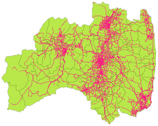 The vehicle tracking map (Figure 2) was built from the G-BOOK telematics data from the Toyota Motor Corporation, which has been available on the internet since 18 March 2011 following the 2011 Tohoku earthquake [19]. Toyota is the largest car manufacturer in Japan, and its vehicle driving data reflect the road conditions after the Tohoku earthquake. The data used in this study were collected in 54 municipalities in the Fukushima prefecture (Figure 3) between 18 March and 30 September 2011 (i.e., approximately six months following the 2011 Tohoku earthquake), excluding municipalities located in the no-go zone due to the accident at the Fukushima Daiichi nuclear power plant.