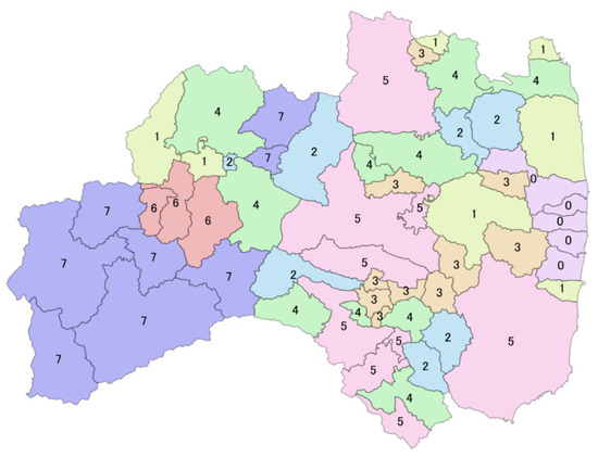 The order of the date at which the recovery reached 90%, averaged for each cluster, is 3 > 5 > 1, 4 > 6 > 2 > 7 (Table 4, Figure 4). We displayed the cluster of each municipality on the map via GIS (0 is a closed area due to the Fukushima Daiichi nuclear power plant accident, Figure 5).