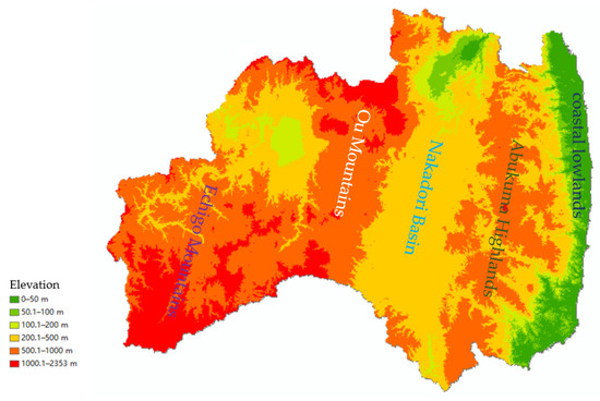 For road-related factors, we used the March 2011 version of the Digital Road Map (DRM) [28] to calculate the distance and area of roads in each municipality. DRM was supplied by the Japan Digital Road Map Association. It is the standard national digital roadmap database used to assist Japanese ITS infrastructures. This database consists of virtual cartographic data in which locations and other information are expressed in numeric form so that computer systems can recognize roads, intersections, etc. The DRM Database allows car vehicle systems and the like to display road maps on their displays and find suitable routes to a destination that avoid traffic congestion. The inspiration for the use of DRM is that the latest version of its map data also includes information about road elevation, which can reflect the actual condition of the road topography. However, older versions, such as the 2011 map of the Fukushima prefecture used in our study, do not have additional elevation information, and we decided to add it ourselves to see how road recovery and topography relate specifically. Additionally, the road density and area of each municipality in the Fukushima prefecture in 2011 were calculated using DRM.