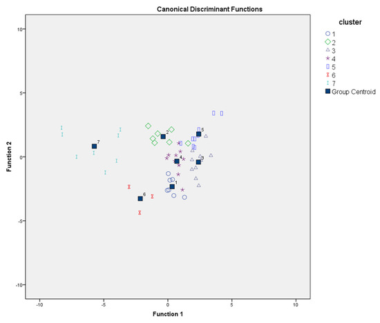 The unstandardized discriminant function and the clustering centers are represented in the following diagram (Figure 7). Based on the use of these two discriminant functions to predict the classification, the correct rate was 92.6% (Table 9). This shows that the results of the cluster analysis can be successfully tested with discriminant functions.