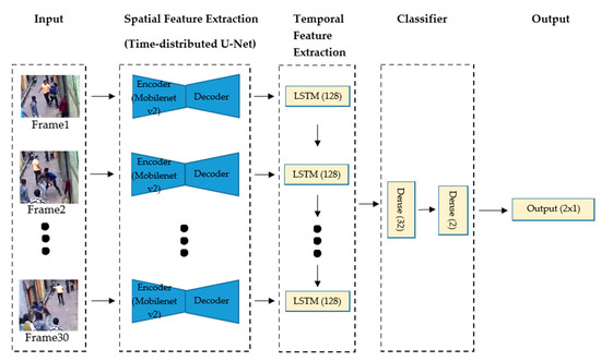 The model receives batches of 30 frames of the security camera videos corresponding to 1 s length slices of the footage. Once the video frame is received by the model, the first stage of the model is a spatial feature extraction using a U-Net-like network. This network uses MobileNet V2 as an encoder in the U-Net-like architecture used to do the static single frame spatial feature extraction in a sequential-time-distributed manner, as shown in Figure 1.
