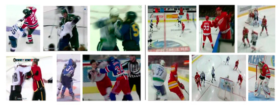 Examples of violent (on the left) and nonviolent (on the right) scenes from the Hockey Fights dataset.