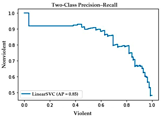 The precision–recall curve shown in Figure 7 illustrates the tradeoff between precision and recall against the RWF-2000 dataset. In the figure, note that the curve represents a high score for recall and precision, which means the proposed method correctly labels the majority of results returned.