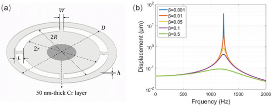 The influence of the damping coefficient on the mechanical response of the diaphragm is analyzed based on Equation (4). According to the purchased glass plate and the customized holder for preparing the microphone, the thickness and total diameter of the wheel-shaped diaphragm are fixed to be h = 150 μm and D = 30 mm, and the rim of the outer ring of the diaphragm is 2.3 mm wide. As a result, the effective diameter of the wheel-shaped diaphragm is 2(r + L) = 25.4 mm. Only the length (L) and width (W) of the beam are adjustable for optimal design of the diaphragm. Assuming A = B = 1 and given W = 2.0 mm and L = 2.3 mm and P0 = 1 Pa, the mechanical frequency response of the diaphragm at normal incidence of sound (θ = 0°) was calculated with different damping coefficients using Equation (4). Figure 1b shows the calculated results. As the damping coefficient increased, the resonance frequency remained at 1231 Hz, but the maximum displacement amplitude decreased at this frequency.