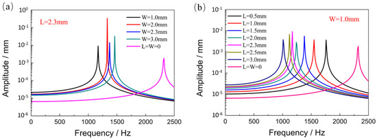Frequency dependences of the displacement at the center of the wheel-shaped glass diaphragms with different beam widths and lengths obtained with FDTD simulation ((a) with a fixed beam length of L = 2.3 mm; (b) with a fixed beam width of W = 1.0 mm).