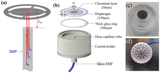 Figure 3b schematically shows the components designed for assembling the fiber-optic microphone head. It contains a wheel-shaped glass diaphragm, a glass ring gasket, and a custom holder. The wheel-shaped glass diaphragm was prepared by laser cutting on a 150-μm-thick glass plate, and it consisted of a central glass disc connected to an outer glass ring by four identical glass beams. The glass diaphragm (including the disc and beams beam) had a diameter of . The glass ring gasket was prepared with a 500-μm-thick borosilicate glass substrate, which was chemically bonded to the outer glass ring of the diaphragm to support the diaphragm from cracking during the microphone head assembly. The specially designed holder with a cylindrical shallow trough and a central through hole was prepared with acrylic block. A glass capillary tube with a silica SMF fixed inside was fixed with epoxy adhesive along the through hole of the custom holder. After chemical bonding of the wheel-shaped glass diaphragm on the thick glass ring, the bonded element was mounted on the top of the custom holder to form an open back air chamber. The fiber tip in the back air chamber points at the center of the glass disc of the diaphragm, forming an extrinsic fiber-optic FPI. The length of the FP cavity defined as the distance between the fiber tip and the disc center is carefully adjusted by monitoring the spectral interference pattern with a spectrometer. To increase the reflectance of the diaphragm, a 50-nm chromium layer was sputtered on the central disc. Note that the chromium layer was chosen as a reflective film based on its excellent adhesion to glass. Figure 3c,d shows the photographs of the microphone head without and with a protection cap.
