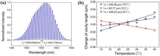 (a) Spectral interference pattern of the FPI based fiber-optic microphone measured at 20 °C; (b) changes of the FP cavity lengths of the microphone versus ambient temperatures for L0 = 245.66, 62.77, and 246.23 μm, respectively.