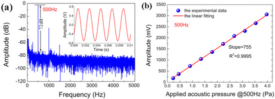 Using the acoustic test platform shown in Figure 4, the temporal response of the prepared fiber-optic microphone to a monotone sound was measured at normal incidence. The incident sound has a frequency of 500 Hz and a pressure of 1 Pa. The measured temporal response is shown in the inset of Figure 7a, and the corresponding FFT result with a frequency resolution of Δf = 1 Hz is displayed in Figure 7a, in which there are the fundamental peak at 500 Hz and the second harmonic peak at 1000 Hz and the third harmonic peak at 1500 Hz. The presence of harmonic signals implies that the fiber-optic microphone under test does not work at the quadrature point and Equation (8) is not satisfied [29]. The signal-to-noise ratio (SNR) for the fundamental signal is 72 dB relative to 1 V. Therefore, the minimum detectable pressure (MDP) for the microphone under test is calculated to be 251 μPa/Hz1/2 based on the following equation [30].
