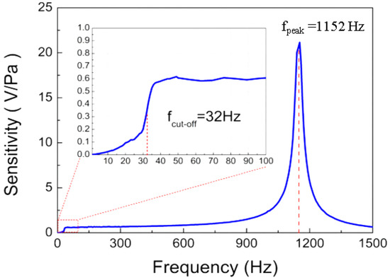 The frequency response of the prepared fiber-optic microphone was investigated under the condition of the normal incidence. Figure 8 shows the measured frequency response curve, which includes a steep slope in the low frequency regime, a plateau located between 50 and 800 Hz and a narrow resonance band with the peak frequency of Hz. The plateau indicates that the microphone presents a relatively flat frequency response in the frequency range of 50 to 800 Hz. The inset is a magnified view of the steep slope, from which the 3 dB cut-off frequency is determined to be 32 Hz. The measured resonance frequency of Hz is slightly smaller than the numerically calculated value of Hz, attributed to the reflective chromium layer deposited on the central disc of the diaphragm, which is not considered in the calculation process. The narrow resonance band shown in Figure 8 presents a full width at half maximum (FWHM) of nm, and the quality factor (Q) of the prepared microphone is calculated as Q = / = 21. This resonance characteristic of the microphone is remarkable, attributed to the open chamber structure that effectively reduces the air damping. The damping coefficient is calculated to be β = 0.024 according to the formula β = 1/(2Q), which is much smaller than that for conventional electret condenser microphones (typically Q = 1 for pressure-field electret microphones). The sharp resonance peak in Figure 8 suggests that the fiber-optic microphone prepared with a wheel-shaped glass diaphragm is suitable for sensitive detection of monotonic sound with a frequency of interest (for example, detection of photoacoustics). This is so because the wheel-shaped glass diaphragm can be precisely designed through simulation guidance to make its resonance peak at the wanted frequency.