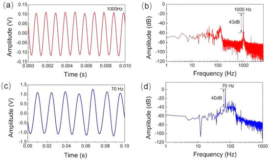 Temporal responses of the fiber-optic microphone to waterborne sounds and the corresponding FFT spectra, (a,b) with 1k Hz waterborne sound, (c,d) with 70 Hz waterborne sound.