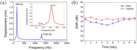 (a) Frequency response to waterborne sound of the wheel-shaped glass diaphragm-based fiber-optic microphone simulated at 1 Pa pressure, (b) SNRs of the fiber-optic microphone at 70 and 1000 Hz measured underwater on different days.