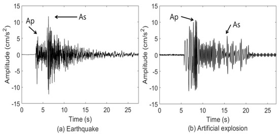 Many studies have shown that earthquakes and artificial explosions have distinct peaks in amplitude. The method in [12,13] is based on the amplitude of P-wave and S-wave in the seismic signal in the time domain. The earthquake with a specific magnitude band () and local distance from 50 km to 200 km, in general, exhibits a peak amplitude of P-wave () less than the peak amplitude of S-wave (). In contrast, the artificial explosion has a larger than . Based on the distinct peak values, the method is used to obtain the peak amplitude ratio. Figure 1 shows the different peak amplitudes of earthquakes and artificial explosions, respectively.