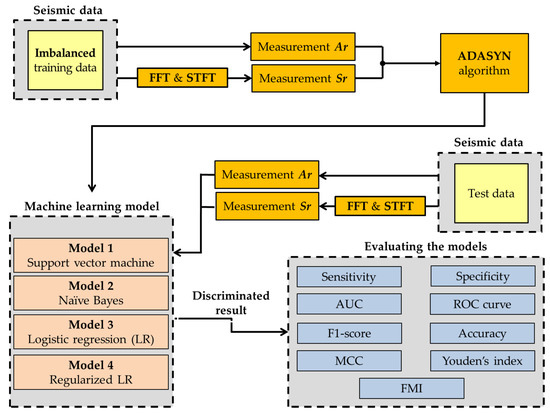 As a third step, classifiers based on SVM, NB, LR, and RLR with ADASYN are applied. Finally, a new seismic dataset that includes and is used to evaluate the performance of the model. For the evaluation of the classification model, nine methods, such as the specificity, sensitivity, receiver operating characteristic (ROC) curve, area under the curve (AUC), F1-score, accuracy, Matthews correlation coefficient (MCC), Youden’s index (YI), and Fowlkes–Mallows index (FMI), are used as performance indicators of binary classification and a comparison value of each seismic discrimination performance.