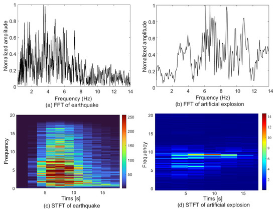 Figure 3 shows the results of STFT and FFT of the earthquakes and artificial explosions, respectively. To simulate seismic discrimination, an imbalanced seismic dataset in which the ratio of earthquake to artificial explosion is 7 to 3 was used to train the classifiers. The training dataset was obtained from seismic events, which exhibited a magnitude range of 1.8–3 and a local distance of 50–200 km. Earthquake and artificial explosion seismic data were measured at the same station under identical conditions of geological characteristics and measurement environment.
