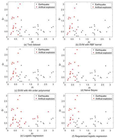 The value of was selected as the optimal parameter of the RLR to avoid overfitting. Figure 4a shows the test dataset to verify the performance of the ADASYN-based classifiers. Figure 4b–f represent the classification results of the SVM classifier with RBF kernel with , SVM classifier with fourth order polynomial kernel, NB classifier, LR classifier, and RLR classifier with , respectively. Table 1 shows the numerical parameters used for the realization of seismic event classification models.