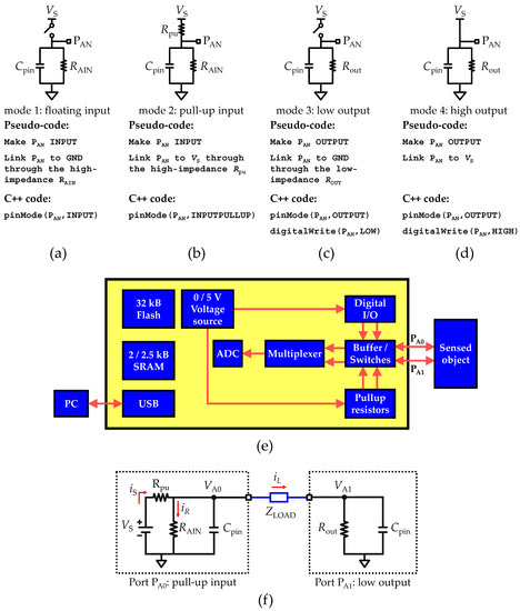 Equivalent circuits for the four operation modes available to configure each analog input/output (I/O) port. (a) mode 1, floating input. (b) mode 2, pull-up input. (c) mode 3, low output. (d) mode 4, high output. Each equivalent circuit is adapted from the schematics provided in the datasheets. (e) Block diagram of the proposed measurement system, including the serial communication and voltage source through USB interface to local PC, flash and SRAM memory, internal voltage source, and internal circuitry to program I/O ports to digital or alternate functionalities. (f) Equivalent circuit of two analog I/O ports bridged with a load impedance (ZLOAD).