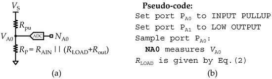 where K is an auxiliary variable used to shorten the length of Equation (2). All the parameters described in Equation (2) are known values, and are available on the datasheet of the micro-controller. The pseudo-code for a routine to measure RLOAD is described in Figure 2b.