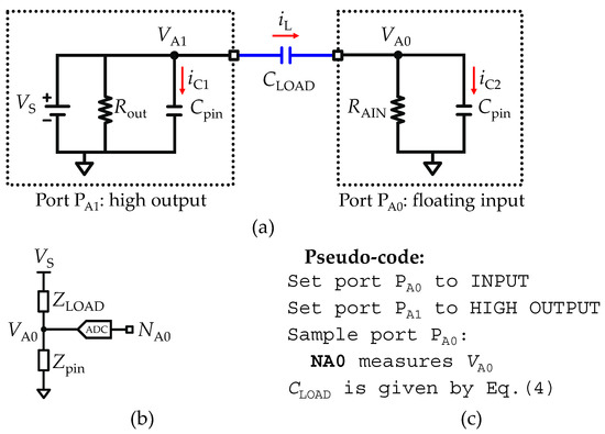 Set-up of a pure load capacitance meter (C-meter). (a) Equivalent circuit of two analog I/O ports bridged with a load capacitance (CLOAD). (b) Reduction of the equivalent circuit to an impedance divider. (c) Pseudo-code used to implement the fast acquisition mode.
