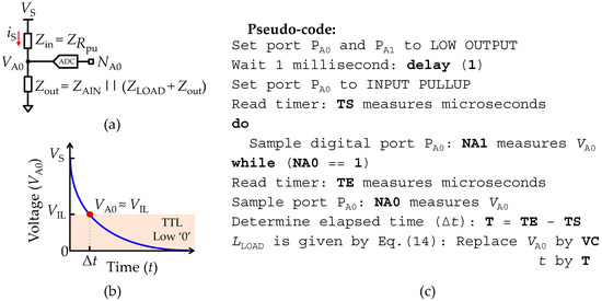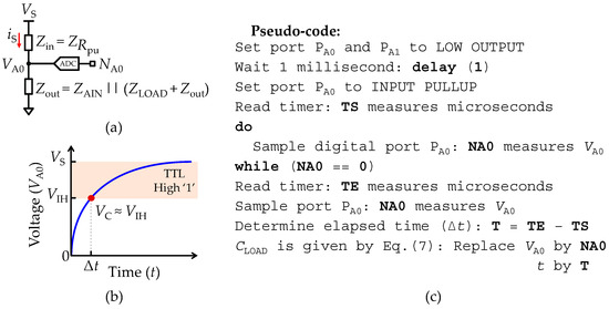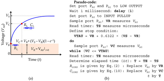 where t is the time that takes charges to accumulate in the capacitance. Figure 5a illustrates the transient response to a voltage step expressed by Equation (10), where the highlighted region consists of the offset voltage (VR) due to the bridge of ports PA0 and PA1 with the serial RC network. As for the reading capacitance voltage level (VC) it is determined when t = τ = RTCLOAD, and is given by VC = VR + (1 − e−1)(VS − VR). Therefore, all parameters in Equation (10) are known except for the time (t). To extract CLOAD, a routine to determine the elapsed time (Δt) until the measured voltage (VA1) is greater than or equal to VC (VA0 ≥ VC) must be implemented. Figure 5b depicts the pseudo-code of a routine to implement the measurement of a serial RC network. In practical terms, CLOAD is found by replacing in Equation (10) VR with the measured value of NA0 at t = 0 (NR), vs. with the maximum resolution of the ADC unit (Nmax) and VA0 and t with the measured value of NA0 and Δt after VA0 ≥ VC, respectively.