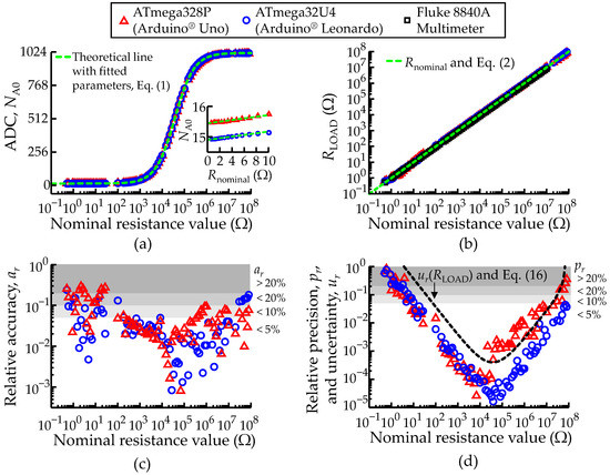 Comparison between the ATmega328P and ATmega32U4 AVR® micro-controllers configured to record an isolated load resistance (RLOAD). (a) Measured ADC unit discrete values at port PA0 (NA0). Each sample consists of an average of 100 consecutive measurements. (b) Measured load resistance (RLOAD) values according to Equation (2). The green dashed lines represent the theoretical lines. (c) Relative accuracy (ar) and (d) relative precision (pr) of the measurements in function of Rnominal. The black dashed line represents the relative uncertainty (ur) of the RLOAD measurements according to Equation (16). The white and grey shading areas highlight the levels of ur, ar and pr better than 5%, 10% and 20%. A legend to describe the color scheme used in all plots of Figure 8 was included.