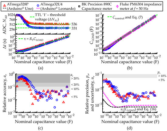 Comparison between the ATmega328P and ATmega32U4 AVR® micro-controllers configured to record an isolated load capacitance (CLOAD) through the transient acquisition mode. (a) Measured ADC value and time (Δt) until the TTL unit changes to digital state high, logic ‘1’ at port PA0 (NA0). Each ADC and Δt sample consist of an average of 100 consecutive measurements. (b) Measured load capacitance (CLOAD) given by Equation (7). The green dashed lines represent the theoretical lines. (c) Relative accuracy (ar) and (d) relative precision (pr) of the measurements in function of Cnominal. The black dashed line represents the relative uncertainty (ur) of the CLOAD measurements according to Equation (16). The white and grey shading areas highlight the levels of ur, ar and pr better than 5%, 10% and 20%. A legend to describe the color scheme used in all plots of Figure 10 was included.