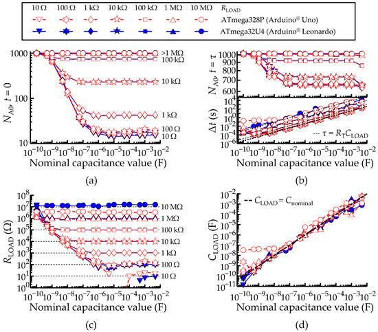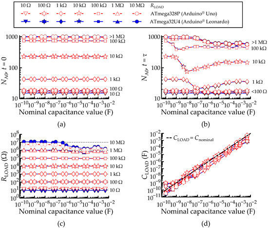 Comparison between the ATmega328P and ATmega32U4 AVR® micro-controllers configured to measure a parallel RC network. (a) Measured ADC value at t = 5τ. (b) Measured ADC value at t = τ. (c,d) Obtained RLOAD and CLOAD values according to Equations (2) and (12), respectively. A legend to describe the color scheme used in all plots of Figure 12 was included. The black dashed lines always represent the theoretical lines.