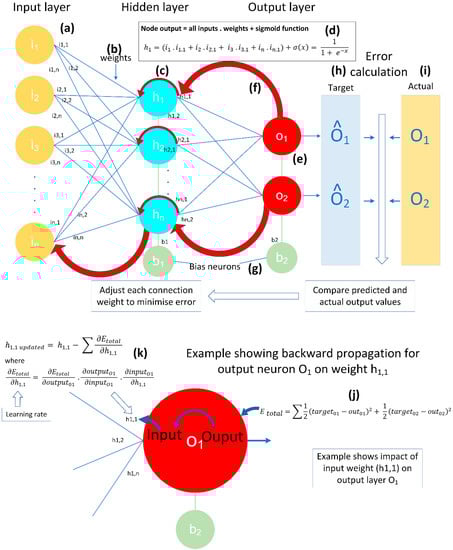 The overall error for the BPNN for that epoch is then calculated as the total error for all output nodes. This is the commencement of the backward propagation part of the training process (Figure 2f), and the mathematical process is shown in Figure 2j. The gradient, also known as the partial error, is calculated for each weight within the BPNN, as shown in Figure 2k, and they are summed to produce the total adjusted weights for each layer. Finally, all of the weights are updated and the process is repeated for the number of epochs defined at the initialization of the BPNN.