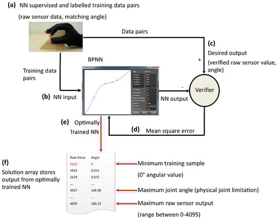 Once the number of requested epochs was reached, the NN epoch with the lowest MSE was selected. If an NN epoch was accepted as the preferred iteration, each raw value segment from the solution array was input into the NN and its output was then predicted by the optimum BPNN for each data glove sensor, as shown in Figure 3e. The solution array was examined by a “smoothing” algorithm devised to remove any unnecessary values beyond the physical limitations for that corresponding finger joint. Smoothing was applied after the full angular range was created by the NN. For example, the index MCP finger joint can flex on average to 95°. Angular values generated beyond this were discarded since they were not physically achievable by a glove wearer. Finally, the raw segment of each data pair in the solution array was normalized by subtracting the smallest raw value from each BPNN-generated value. The raw values were then used as a lookup key during angular calculation.