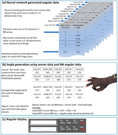 Ten arrays were used to represent each of the ten sensors in the 5DT data glove as shown in Figure 4a. Angular output for each sensor was generated using real-time raw sensor data that was subtracted from the stored “flat-hand” value for each sensor to create the lookup key (Figure 4b). Each lookup key contained the location within the relevant sensor array to the angular value as calculated by the BPNN. The angular value was then displayed within the data glove-controlling software (Figure 4c). In the example shown in Figure 4b, the “flat hand” value for the index MCP sensor was represented by the sensor value 1201. This was the numerical value that was output by the data glove index MCP sensor when the wearer placed their hand on a flat surface. This value was used to generate the lookup key for the 2D array. The example shown in Figure 4b shows that the index MCP sensor outputted a value of 1257 during one cycle of sensor output. Consequently, the lookup key for the index MCP sensor was 1257 − 1201 = 56 for that sensor output. Therefore, the angular value representing sensor value 1257 was contained in the indexed position in the MCP array that was stored in location 56.
