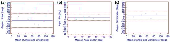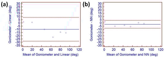 Figure 6b displays the agreement of NN-generated values to accurate angles. Improvements in angular accuracy compared to goniometric and linear angular values are immediately apparent. Readings remained consistently close to the mean angular blue line, indicating a strong agreement between the goniometric measurements and those generated using a NN. Results also indicated that angular values calculated linearly and those generated using the NN-generated range are both comparable to traditional goniometric measurement.