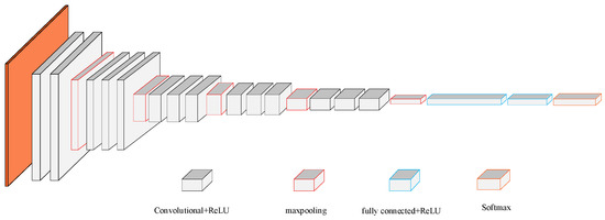 The network structure diagram of VGG16 is shown in Figure 2. The orange part represents the input signal images. If the size of the input signal image is 224 × 224 × 3, 3 indicates that the image is colored, and 224 is the pixel value of the image. Black cubes are convolutional layers that are mainly used to extract features. The red cubes are pooling layers, which are mainly used to retain the main features of the images.