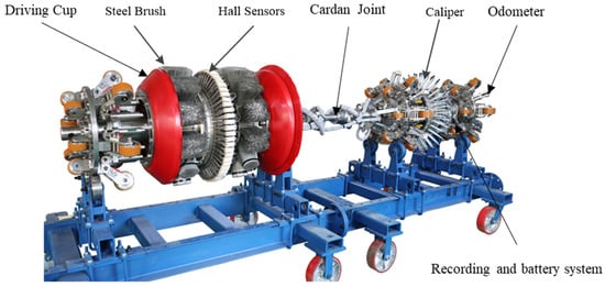 As shown in Figure 3, the MFL in-line inspection tool is often composed of a driving cup, magnetic flux leakage unit, caliper, recording and battery system, and odometers, which are connected by a Cardan joint in the middle. The MFL unit consists of a yoke, a permanent magnet, several steel brushes and Hall sensors. It is a central part of the inspection tool and can collect signals of the magnetic field and MFL on the magnetized pipeline wall. Different sizes of in-line inspection tool have different numbers of Hall sensors covering the circumference of the pipeline. When there are more Hall sensors, the collected signals are clearer. Driven by the medium transported in the pipeline, the tool can move forward inside the pipeline under the pressure difference in front of and behind the driving cup to identify and inspect the corrosion defects inside and outside the pipeline, wall thickness variation, weld defects, and pipeline features. Additionally, the tool can provide information on defects, including area, depth, orientation, and position.