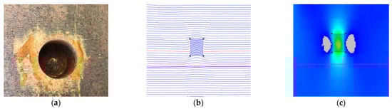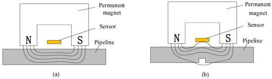 The technical principle of MFL in-line inspection is to judge the severity of defects in an inspected workpiece by measuring the MFL on the surface of a magnetized ferromagnetic material. After a ferromagnetic material is magnetized by an externally applied magnetic field, if it is continuous and uniform, the magnetic lines of force in the material will be constrained inside the material and will not penetrate the surface of the material, as shown in Figure 4a [34]. However, if there are any defects on the surface or inside the ferromagnetic material, there is low magnetic permeability and high magnetic reluctance at the position of the defect. The magnetic lines of force first pass through the area with a lower magnetic reluctance. When the magnetic induction intensity inside the material is high or the defect is large, the material near the defect cannot bear a higher magnetic flux. Thus, a portion of the magnetic flux flows out of the workpiece from the position of the defect, passes through the workpiece above the defect, and then reenters the workpiece. In this manner, a magnetic leakage field is formed outside the workpiece, as shown in Figure 4b [34]. The total magnetic flux through the cross-sectional area of the steel plate is [35]: