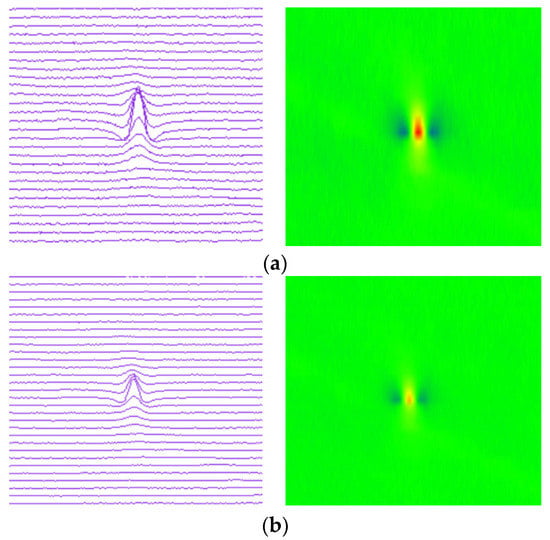 In the process of in-line inspection, the MFL signal will be affected by pipeline internal environment, impact vibration, and other factors, such as the corrosion defects, welds, wax, or waste in the pipeline. These factors will lead to the lift-off of the sensors. The lift-off sensors will produce interference signals from the dynamic lift-off, thus affecting the inspection results. Figure 6 shows the MFL signals of the sensor with different lift-off values at the same corrosion defect. The lift-off of the sensors are 0 mm, 1 mm, and 2 mm, respectively. When the sensor is close to the pipeline wall (with 0 mm lift-off), the inspection signal amplitude is the largest and the signal is clear; when the sensor is lifted away by 1 mm and 2 mm respectively, it can be seen from the figure that the leakage magnetic field strength detected by the sensor becomes weaker. If the sensor is lifted-off to a certain distance, it will cause inspection failure. In addition, pipeline defects or features do not exist singly. Different defects or features will also compound together. As the input of deep neural network, the pseudo-color image of magnetic flux leakage detection is also affected by the lift-off value or compound signals, which makes feature extraction more difficult.