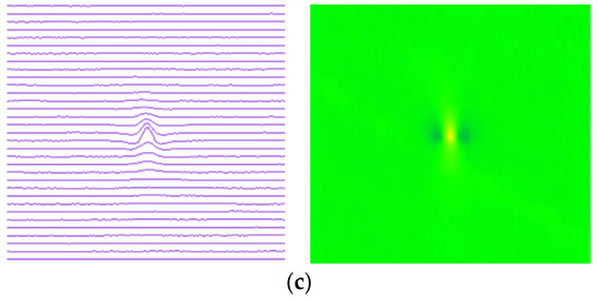 where the represents the pseudo-color image pixel corresponding to the actual MFL inspection value. M is the number of sensor channels for MFL in-line inspection tool. The more sensors used, the greater the number of signal channels, and the pseudo-color image of MFL is clearer. N is the sampling spacing in the forward direction of a pipeline. The smaller the sampling spacing, the clearer the pseudo-color image of MFL. Figure 5 shows a comparison of the real defect, MFL curve, and pseudo-color image.
