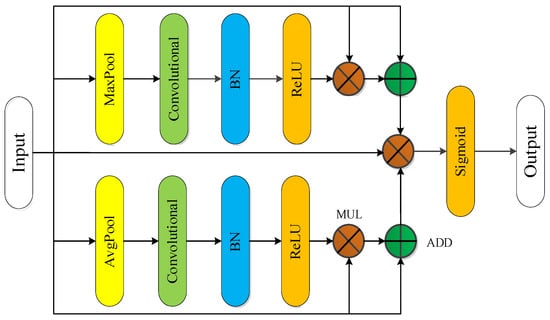 The module consists of convolution, batch regularization, and an activation function, which can extract mixed information by integrating channel and semantic information. Then, the average pooling module, convolution and activation function ReLU are adopted to process the features, where ADD is the addition operation and MUL is the multiplication operation, to obtain the function ; at the same time, the max pooling module, convolution and activation function ReLU are used in parallel with the average pooling module for another feature extraction to obtain the function . The designed attention feature map has features of both average pooling and max pooling. The attention feature is multiplied with the input feature map and superimposed with the input feature to as the weight to influence the input feature map. Finally, a structure similar to the jump connection was used to reduce the negative impact of the attention module on the input feature map, and the Sigmoid activation function was used to output the final feature map [40,41]. The calculation process is as follows.