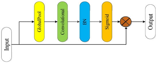 By using the spatial attention module, useful information in the input image can be focused on. Figure 8 shows the designed spatial attention module, which focuses on the spatial or semantic feature information in the feature map [42]. By use of global average pooling, the length and width of the feature map are compressed into one, leaving only the spatial information. Then, the convolutional layer is used to learn the association between spatial information and classification information (semantic information), and batch regularization and activation function Sigmoid are used to transform this association into nonlinear change [43]. To avoid excessive loss of feature information caused by pooling, it was multiplied by the feature map without average pooling. The result of multiplication is input to the next module as the weight to influence the input feature map, so as to complete the task of refining semantic information.