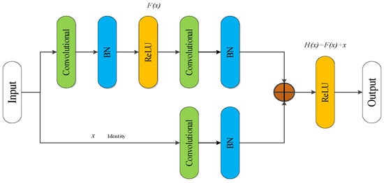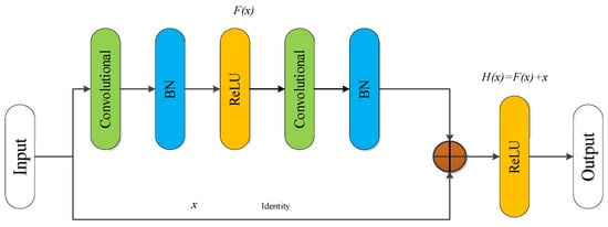 where and represent the output and input of the n-th residual unit, respectively. represents unit mapping, and is the ReLU activation function. As can be seen from Equation (9), the features for learning from layer n to layer N are