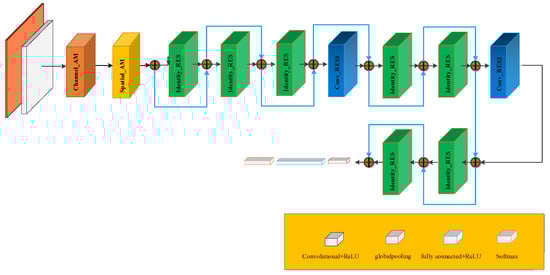 where Equation (10) represents the actual updated gradient of the loss when passing through the n-th layer. The first part in the formula represents the preserved gradient of directly transmitting the original features through the identity channel. The second part is the residual gradient related to the weight parameters of the residual network. If the output size of the previous layer and the input size of the current layer do not match each other, it is necessary to add a convolutional layer to match the output of the previous layer, that is, the Convolutional Residual module (Conv_RES). The structure of the convolutional residual module is shown as in Figure 10. Where the convolution kernel size on the identity is set to 1 × 1, the stride is set to 1 × 2, and the number of convolution kernels N depends on the specific structure.