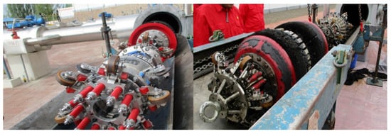 An in-line inspection tool is driven by the pipeline transport medium (crude oil or natural gas) to run in the pipeline, inspect, and locate the deformation, corrosion, and other damages to the pipeline in real time. Most oil and gas pipelines are buried underground. Through in-line inspection of the pipeline, various defects and damages can be found in advance, and the risk degree of each pipeline section can be understood to prevent and effectively reduce accidents and save pipeline maintenance funds, which is an important method to ensure pipeline safety. The status of in-line tool before and after running are shown in Figure 12. It can be seen from Figure 12, that there are wax, dirt, and other impurities in the pipeline, which affect the quality of the long-term signal acquisition of the tool. In addition, the tool is susceptible to welds and other influences, resulting in the lift-off of the sensor and other phenomena, further making the inspection signals vulnerable to noise interference.
