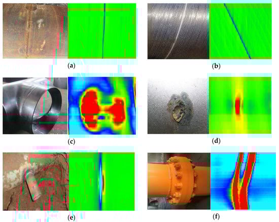 MFL pseudo-color images of different pipeline features (a) Girth weld. (b) Spiral weld. (c) Tee. (d) Corrosion. (e) Illegal hot tapping. (f) Flange.