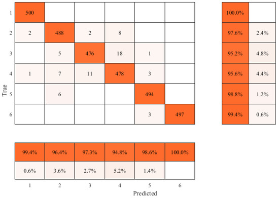 The confusion matrix of the classification results obtained using the proposed method is shown in Figure 15. The performance of the trained neural network model was evaluated by classification accuracy of testing set, and the following evaluation indexes were used: